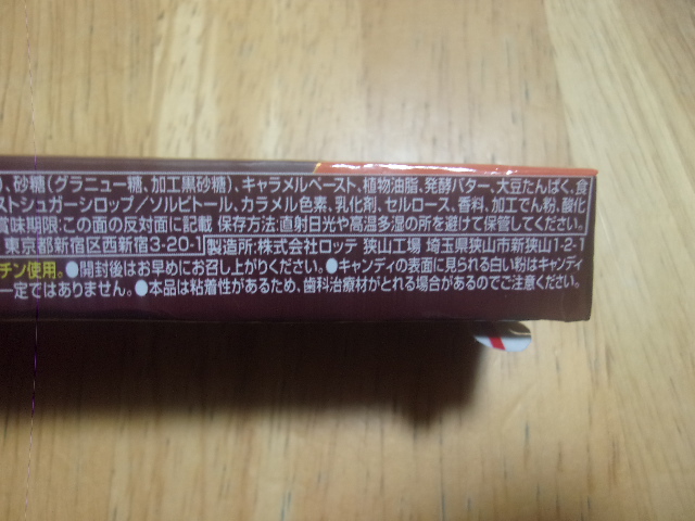 水あめ(国内製造)、砂糖(グラニュー糖、加工黒砂糖)、キャラメルペースト、植物油脂、発酵バター、大豆たんぱく、食塩、でん粉、カカオペースト、ゼラチン、ローストシュガーシロップ/ソルビトール、カラメル色素、乳化剤、セルロース、香料、加工でん粉、酸化防止剤(ビタミンE)、酸味料