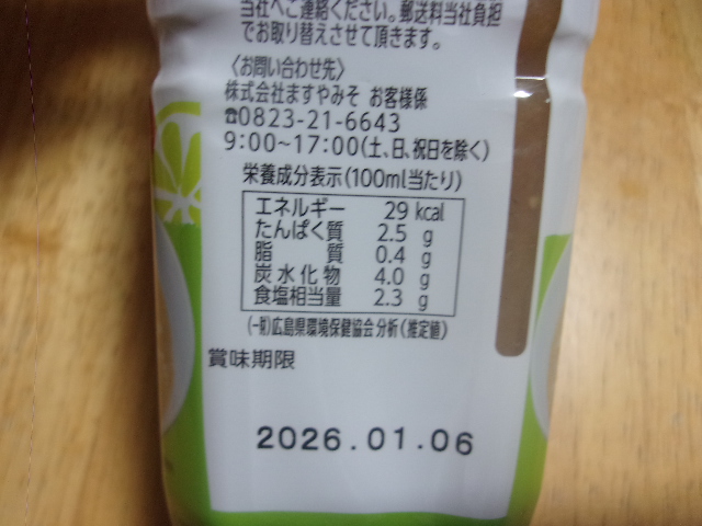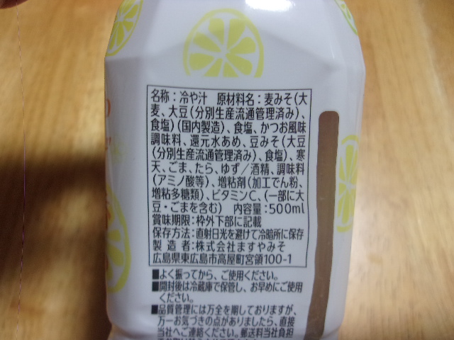 麦みそ(大麦、大豆(分別生産流通管理済み)、食塩)(国内製造)、食塩、かつお風味調味料、還元水あめ、豆みそ(大豆(分別生産流通管理済み)、食塩)、寒天、ごま、たら、ゆず/酒精、調味料(アミノ酸等)、増粘剤(加工でん粉、増粘多糖類)、ビタミンC、(一部に大豆・ごまを含む)