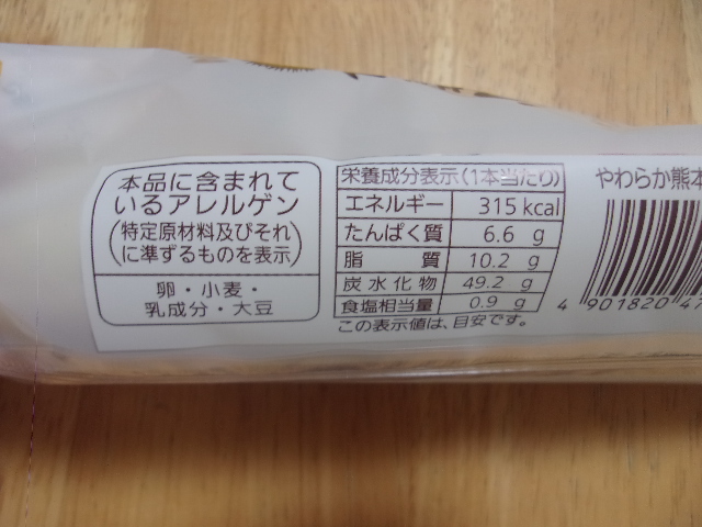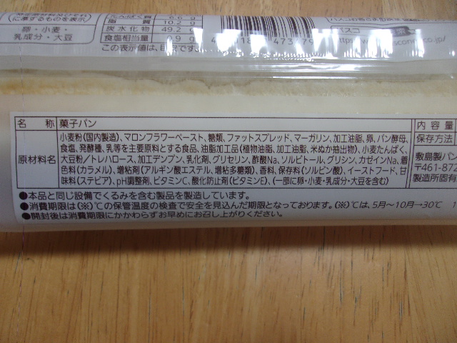 小麦粉(国内製造)、マロンフラワーペースト、糖類、ファットスプレッド、マーガリン、加工油脂、卵、パン酵母、食塩、発酵種、乳等を主要原料とする食品、油脂加工品(植物油脂、加工油脂、米ぬか抽出物)、小麦たんぱく、大豆粉/トレハロース、加工デンプン、乳化剤、グリセリン、酢酸Na、ソルビトール、グリシン、カゼインNa、着色料(カラメル)、増粘剤(アルギン酸エステル、増粘多糖類)、香料、保存料(ソルビン酸)、イーストフード、甘味料(ステビア)、pH調整剤、ビタミンC、酸化防止剤(ビタミンE)、(一部に卵・小麦・乳成分・大豆を含む)