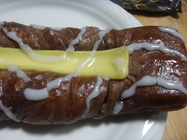 その上に カスタード味クリーム が絞られ、さらに仕上げとして 甘いアイシング がコーティングされています。