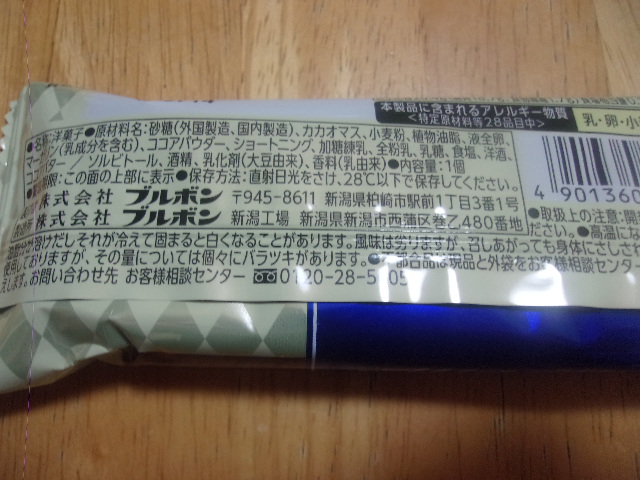 砂糖、カカオマス、小麦粉、液全卵、植物油脂、バター、ココアパウダー、ショートニング、加糖練乳、全粉乳、乳糖、ココアバター、洋酒、食塩/ソルビトール、酒精、乳化剤(大豆由来)、香料