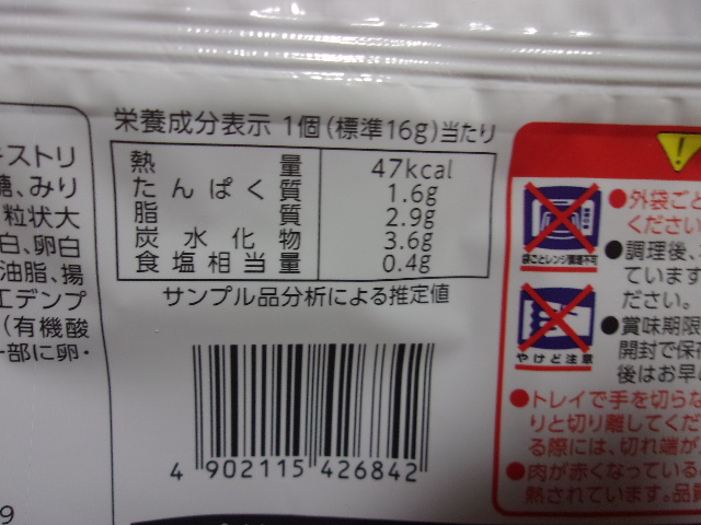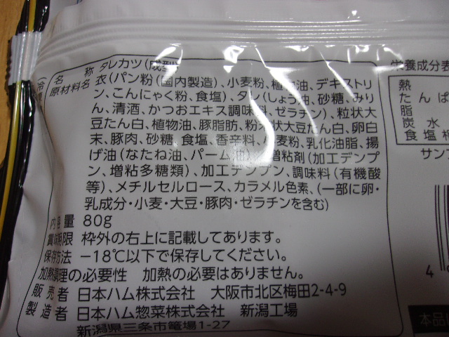 衣(パン粉(国内製造)、小麦粉、植物油、デキストリン、こんにゃく粉、食塩)、タレ(しょう油、砂糖、みりん、清酒、かつおエキス調味料、ゼラチン)、粒状大豆たん白、植物油、豚脂肪、粉末状大豆たん白、卵白末、豚肉、砂糖、食塩、香辛料、小麦粉、乳化油脂、揚げ油(なたね油、パーム油)/増粘剤(加工デンプン、増粘多糖類)、加工デンプン、調味料(有機酸等)、メチルセルロース、カラメル色素、(一部に卵・乳成分・小麦・大豆・豚肉・ゼラチンを含む)