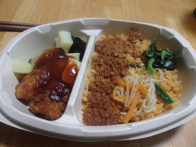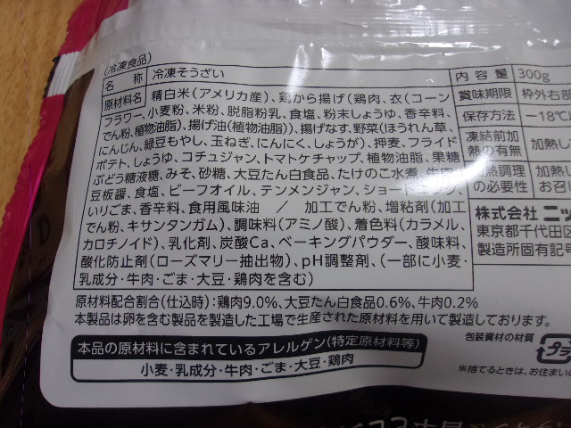 鶏から揚げ(鶏肉:タイ)、揚げなす(なす:中国)、ほうれん草(中国)、にんじん(中国)、緑豆もやし(日本)、玉ねぎ(中国)、にんにく(中国)、しょうが(中国、台湾)